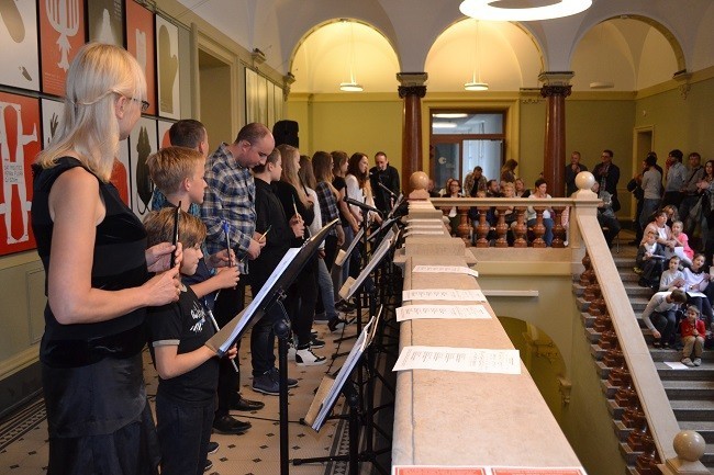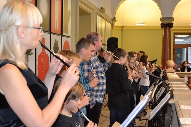 1 października 2016r. Akademia Sztuki wypełniła się dziećmi  i nauczycielami. Wszyscy przyszli tu, aby rozwijać swoje umiejętności gry na flażolecie podczas warsztatów zorganizowanych dla dwóch grup zaawansowania dzieci młodszych (ok. 100 uczniów) i jednej grupy nauczycieli (27 osób), do której dołączyli najlepsi flażoleciści z zaprzyjaźnionych szkół (12 osób). Warsztaty dla nauczycieli prowadził Pan Wojciech Wietrzyński propagator gry na flażolecie w Polsce wraz ze swoją córką Katarzyną- najlepsza instrumentalistka. Spotkanie z flażoletem dla dzieci prowadziły Renata Kaczkowska z SP1, Barbara Łoziuk z SP 51, Iwona Wierzbicka z SP w Przecławiu, Magdalena Witkowska z SOSW w Tanowie. W realizację tego projektu włączyło się Polskie Stowarzyszenie Pedagogów i Animatorów KLANZA oraz Szkoła Podstawowa w Przecławiu. Przy przedsięwzięciu aktywnie pomagały studentki Wydziału Edukacji Muzycznej. Czterogodzinne  warsztaty zakończyły się koncertem, na którym dzieci muzykowały wspólnie ze Swarzędzką Orkiestrą Flażoletową. Słuchaczami byli rodzice, którzy podziwiali swoje pociechy oraz umiejętności muzyków ze Swarzędza gromkimi brawami. Pomysłodawcą tego przedsięwzięcia i jego realizatorką była Iwona Wierzbicka, która zgłosiła to wydarzenie do Ogólnopolskiego Ruchu Flażoletowego już w grudniu ubiegłego roku. Z ramienia Akademii Sztuki wspierała tę inicjatywę dr Alicja Delecka-Bury. Międzynarodowy Dzień Muzyki  zaliczamy do bardzo udanych.