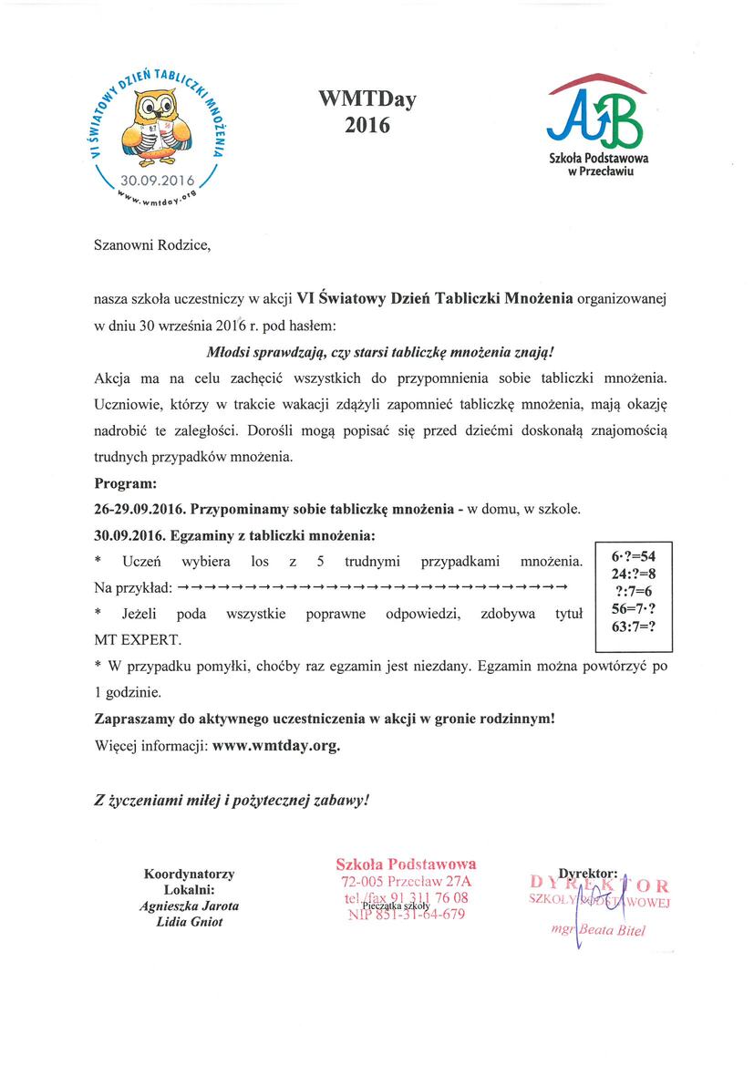 Nasza szkoła uczestniczy w akcji VI Światowy Dzień Tabliczki Mnożenia organizowanej w dniu 30 września 2016 r. pod hasłem: Młodsi sprawdzają, czy starsi tabliczkę mnożenia znają!