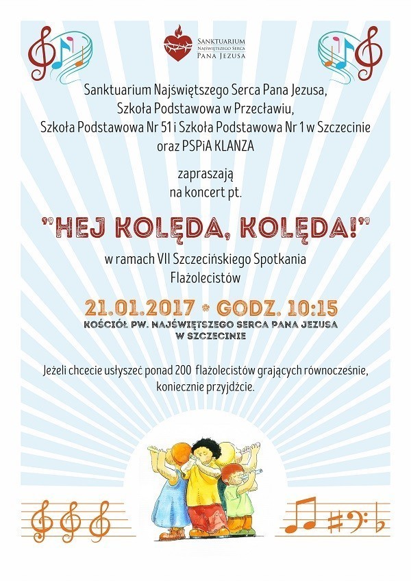 Serdecznie zapraszamy na Koncert „Hej Kolęda, Kolęda”, który odbędzie się 21 stycznia 2017 r. o godz. 10.15 w Kościele pw Najświętszego Serca Pana Jezusa w Szczecinie. W koncercie wystąpią nasi uczniowie – grupa flażolecistów. Afisz –