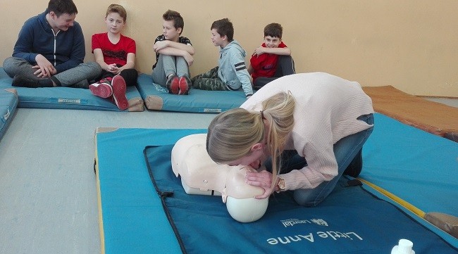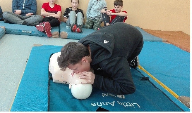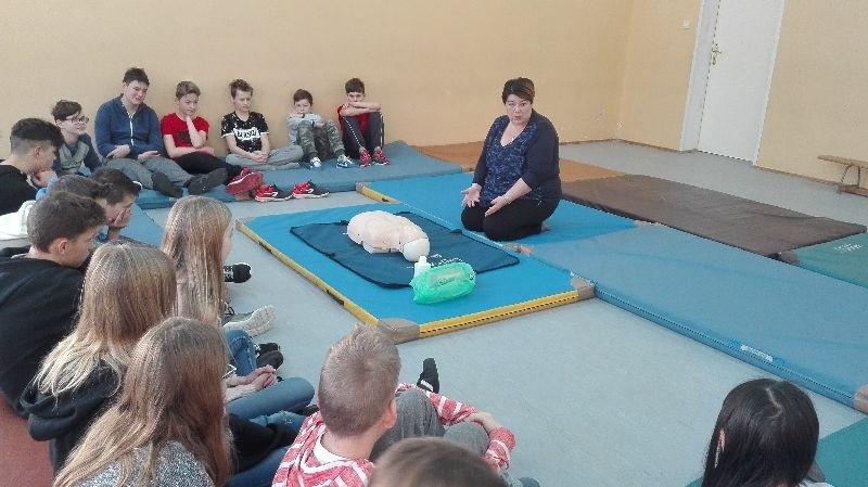 Korzystając z uprzejmości p. Edyty Tracz uczniowie klasy 7c, w ramach lekcji wychowania fizycznego wzięli udział w praktycznych zajęciach z udzielania pierwszej pomocy przedmedycznej. Każdy uczeń po wysłuchaniu krótkiego wykładu teoretycznego, mógł w praktyce wykorzystać zdobytą wiedzę ćwicząc na profesjonalnym fantomie. Co ciekawe, uczniowie posiadali sporą wiedzę w tym zakresie, którą zapamiętali z poprzedniego wykładu, który miał miejsce dwa lata temu. Umiejętność udzielania pierwszej pomocy jest niezbędna ale obyśmy nigdy nie musieli z niej korzystać….