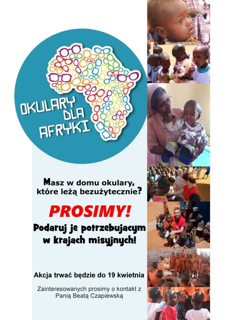 Akcja jest organizowana przez Papieskie Dzieła Misyjne Archidiecezji Szczecińsko-Kamieńskiej przy współpracy z p. dr. hab. n. med. prof. PUM Jerzy Sieńko i Zachodniopomorskim Kuratorem Oświaty Magdalena Zarębska-Kuleszą. Zebrane okulary zostaną przekazane szpitalowi w miejscowości Wamba w centralnej Kenii. Czas zbiórki to Wielki Post 2019. Okulary lecznicze mogą być zarówno używane, jak i nowe. Zebrane przedmioty można przynieść do naszej szkoły.