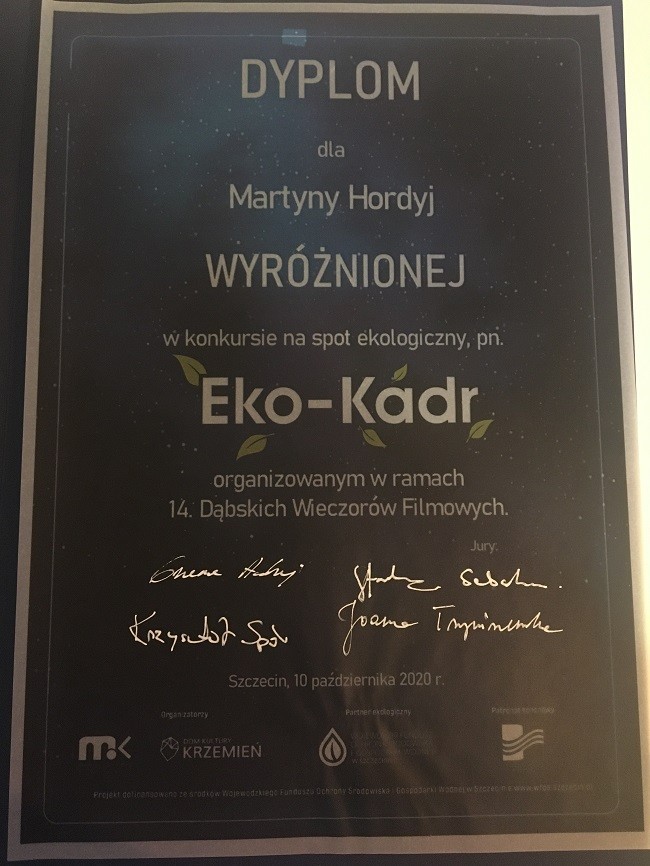 Informujemy, że nasze uczennice kl. 5a – Martyna Hordyj i Nikola Zarzycka otrzymały wyróżnienie w I konkursie ekologicznym „Eko-Kadr” w kategorii „Moja woda”. Celem głównym konkursu było podniesienie świadomości ekologicznej społeczeństwa, poprzez tworzenie materiałów edukacyjnych w postaci spotów wideo w dwóch kategoriach: Czyste powietrze” i „Moja woda”. Serdecznie gratulujemy!