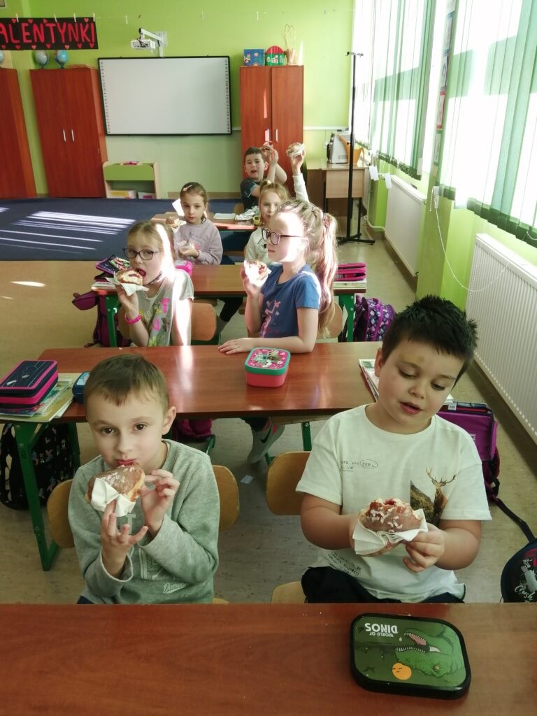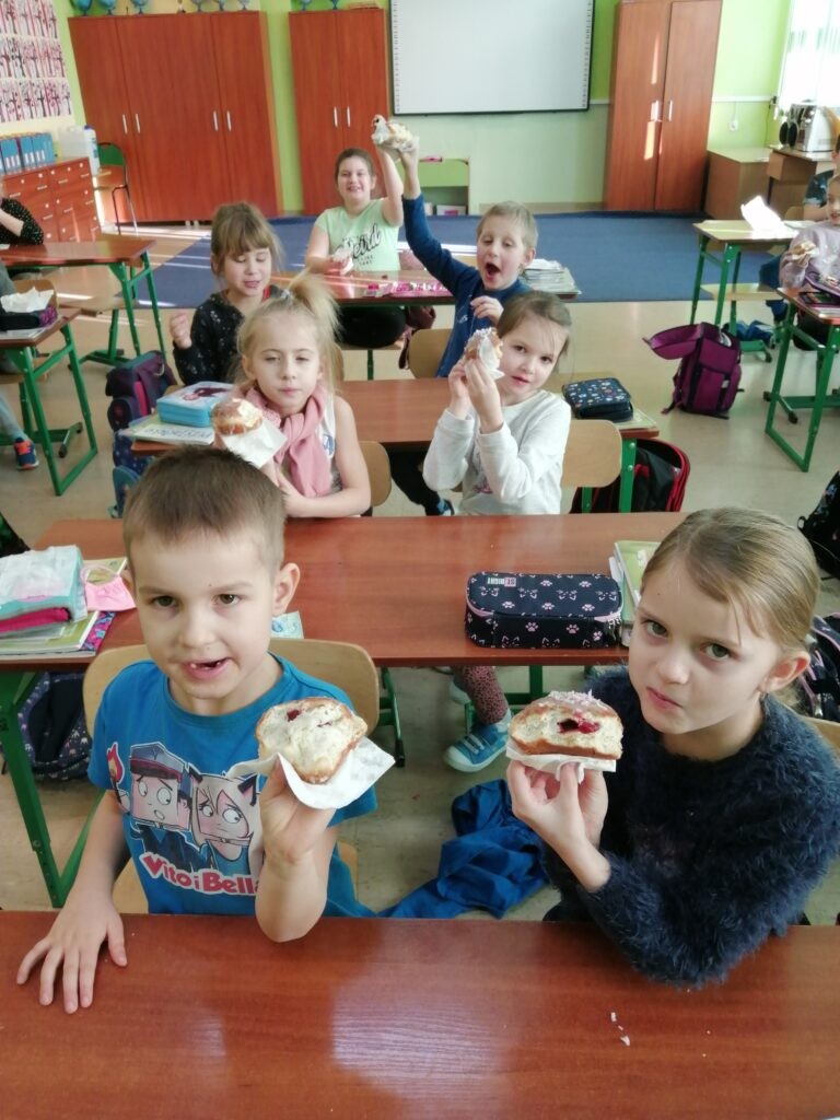 Jak tradycja nakazuje w Tłusty Czwartek można objadać się pączkami . Dla pierwszaków polskie tradycje i zwyczaje są bardzo ważne, dlatego w tym dniu nie mogło zabraknąć pysznych pączków zakupionych przez rodziców. Podczas jedzenia odbył się konkurs, polegający na tym, żeby nie oblizywać się podczas jedzenia. Pierwsza poległa pani wychowawczyni, inni dzielnie walczyli podczas jedzenia, ale tylko nielicznym udało się to trudne zadanie. Pączki były pyszne, a zabawa przednia! Joanna Dobosz