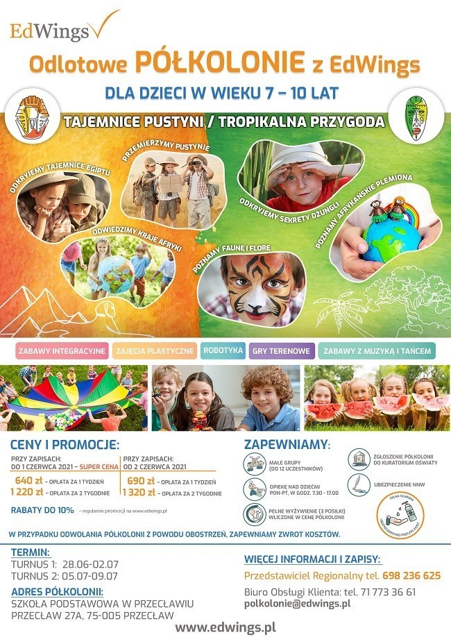 EdWings zaprasza dzieci w wieku 7-10 lat na ODLOTOWE LETNIE PÓŁKOLONIE w Szkole Podstawowej w Przecławiu. I Turnus – 28.06. – 02.07.– „Afryka – TAJEMNICE PUSTYNI”,II Turnus– 05.07– 09.07. – „Afryka – TROPIKALNA PRZYGODA”. Szczegółowe informacje