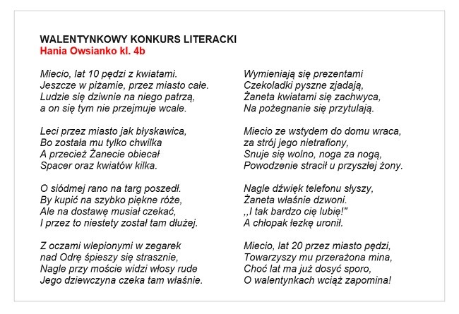 W drugim półroczu odbył się konkurs literacki dla klas IV – VIII. Chętni uczniowie mogli napisać wiersz, którego tematem była miłość lub przyjaźń. Laureatami konkursu  zostali: I miejsce – Hanna Owsianko klasa 4b, II miejsce – Lorin Jomma klasa 6b. Gratulujemy zwycięzcom, dziękujemy za udział w konkursie i życzymy powodzenia w rozwijaniu uzdolnień polonistycznych. Agnieszka Szubińska. Nagrodzone prace –