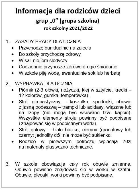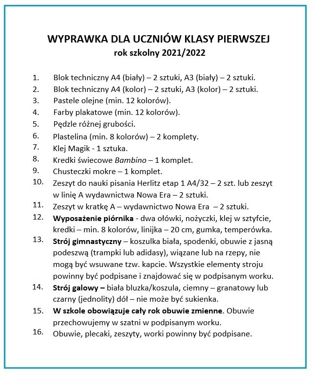 Przekazujemy listę przyborów potrzebnych dla ucznia klasy pierwszej i dzieci grupy „0” (szkolnej) –