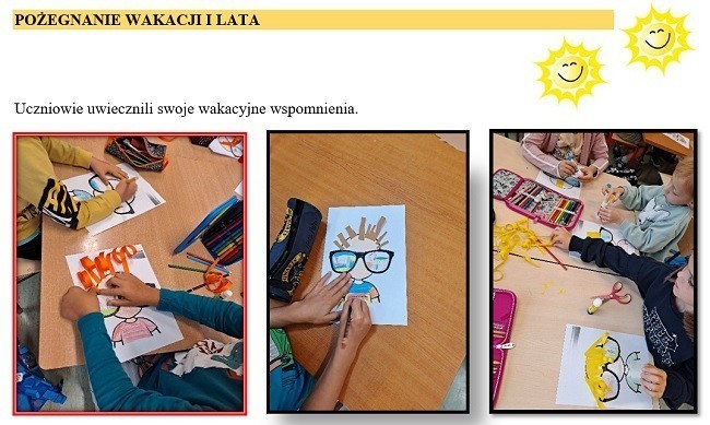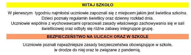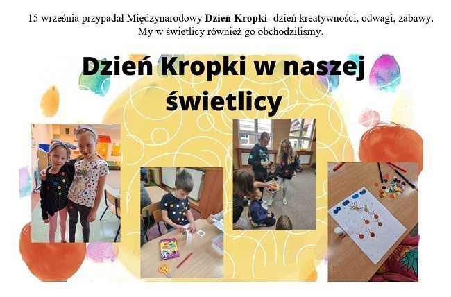 We wrześniu w świetlicy szkolnej realizowane były następujące tematy: Witaj szkoło, Bezpieczeństwo na ulicach oraz w szkole, Pożegnanie wakacji i lata, Dzień Kropki i Świat jesienią i Jaki jestem Ja, jaki jesteś Ty? poznajemy się wzajemnie. Zapraszamy do obejrzenia foto-relacji–