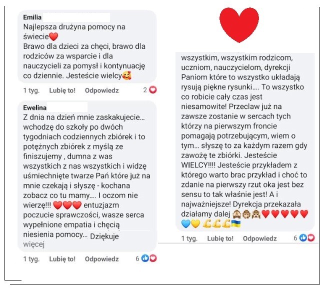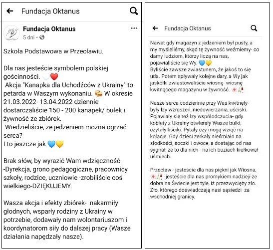 Choć wojna cały czas trwa, to myślimy, że już teraz trzeba dziękować wszystkim zaangażowanym w naszą akcję, wszystkim, którzy bezinteresownie, w szlachetnym odruchu serca w różny sposób pomagają naszym sąsiadom. Mamy nadzieję, że nie zabraknie nam zapału do takich działań. Stanęliśmy na wysokości zadania i pomagamy jak tylko możemy.