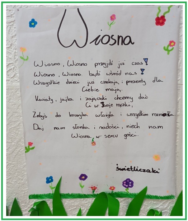 Długo wyczekiwana, wreszcie nadeszła- wypatrywana przez nas wszystkich- WIOSNA kalendarzowa. Świetliczaki z radością rozmawiały o przejawach wiosny w przyrodzie, pierwszych kwiatach i zwierzętach, które zwiastują wiosnę. Dzieci chętnie rozwiązywały zagadki i krzyżówki o tematyce wiosennej. Znalazło to odzwierciedlenie w pracach plastycznych o tematyce wiosennej.