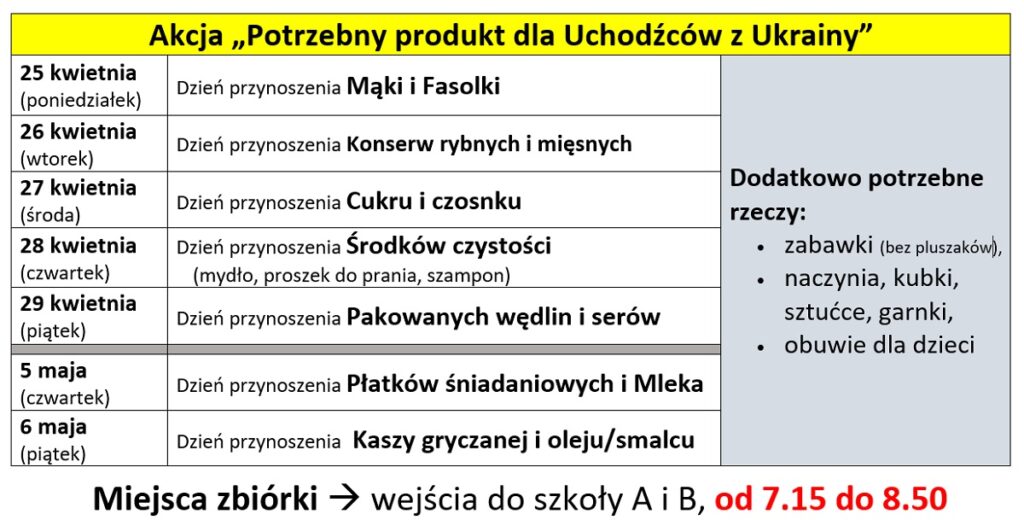 Serdecznie dziękujemy całej społeczności szkolnej za dotychczasową pomoc dla Uchodźców z Ukrainy. Nasze zbiórki kanapek i produktów wsparły bardzo wiele osób. Potrzeby nadal są… Relacje w mediach i wzruszające podziękowania dodają nam chęć dalszego działania. (zapraszamy na  https://szkolaprzeclaw.pl/2022/04/08/tysiace-kanapek-dla-uchodzcow-z-ukrainy). Od 25 kwietnia szkoła wznawia akcję „Potrzebny produkt dla Uchodźców z Ukrainy”. Nasz punkt na ul. Hryniewieckiego 1 w Szczecinie potrzebuje rzeczy, które umożliwią potrzebującym przygotowanie posiłków. Mamy harmonogram przynoszenia darów, poniedziałek to Dzień mąki i fasolki, wtorek – Dzień konserw rybnych i mięsnych, we środę możemy przynosić cukier i czosnek itd. Dodatkowo potrzebne są: zabawki (bez pluszaków), naczynia, kubki, sztućce, garnki, obuwie dla dzieci. Miejsca zbiórki – wejścia do szkoły A i B, od 7.15 do 8.50. Harmonogram zbiórek darów –