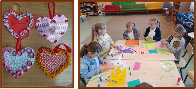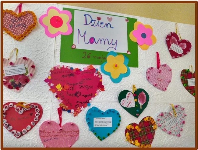 Przez ten tydzień dzieci – z niewielką pomocą nauczyciela – robiły dla swoich mam laurki, oraz wiszące papierowe serduszka – do powieszenia w dowolnym miejscu w domu.