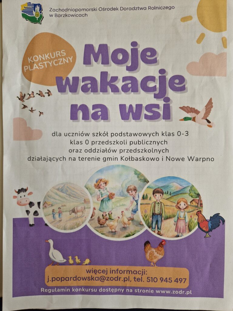 Zachodniopomorski Ośrodek Doradztwa Rolniczego w Barzkowicach ogłasza konkurs plastyczny dla klas 0-3 na temat „Moje wakacje na wsi”. Regulamin oraz zgody są dostępne w świetlicy szkolnej. Zachęcamy wszystkich do udziału.