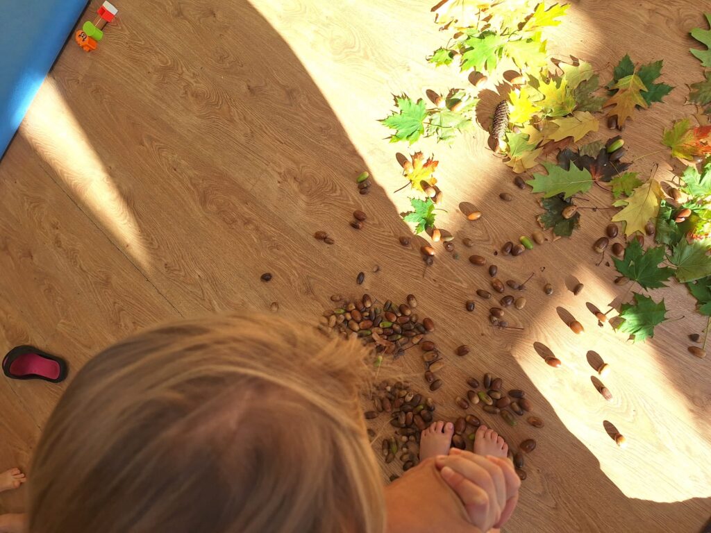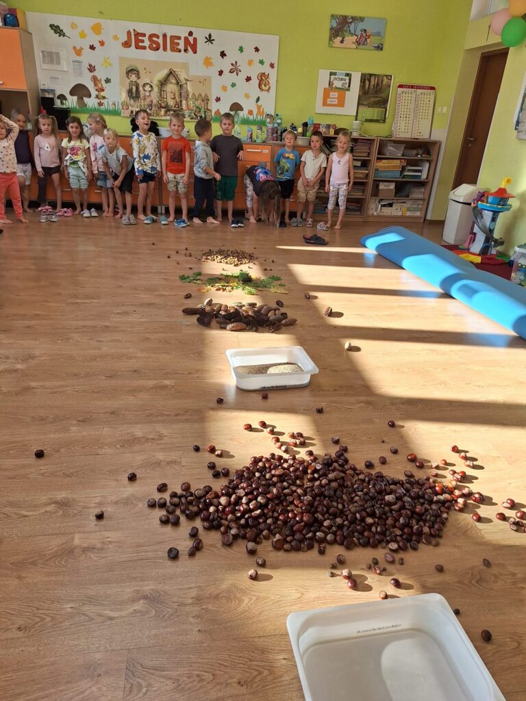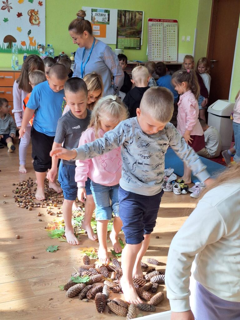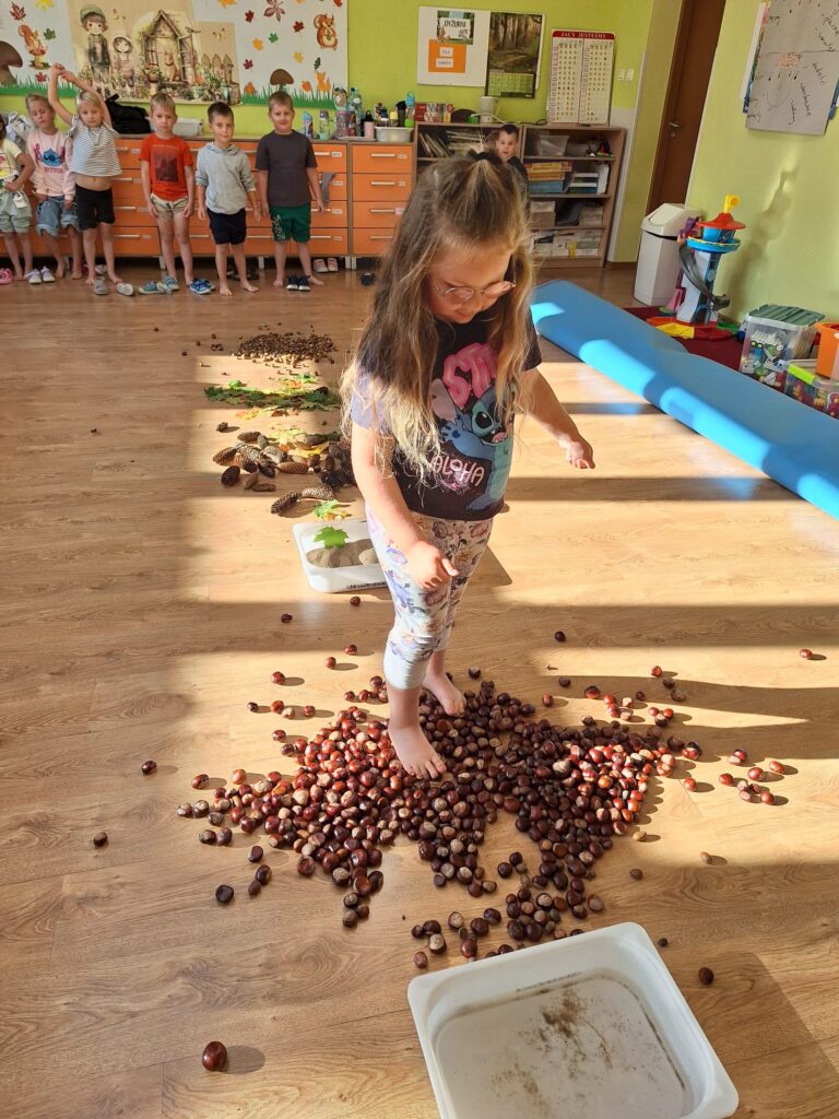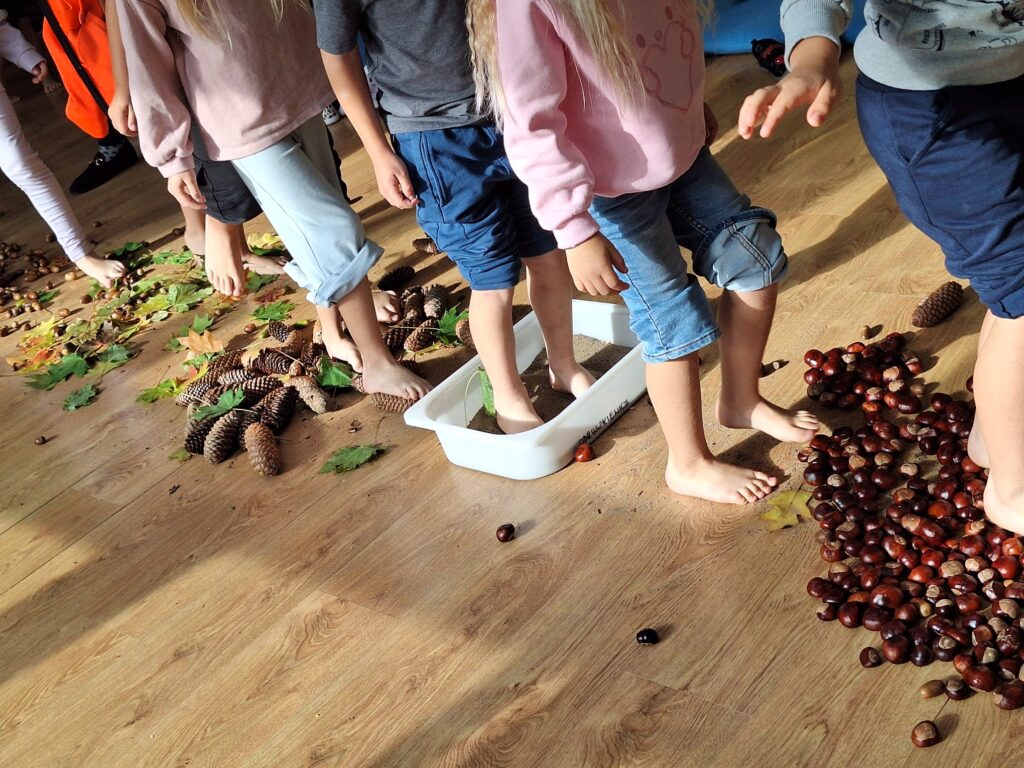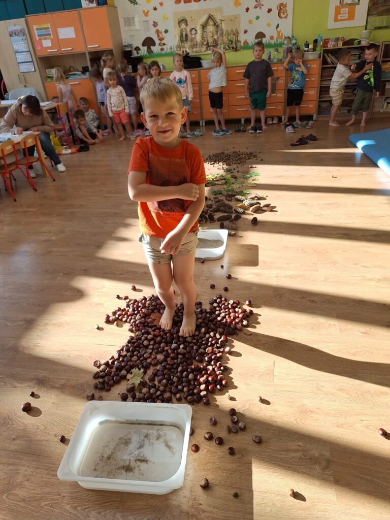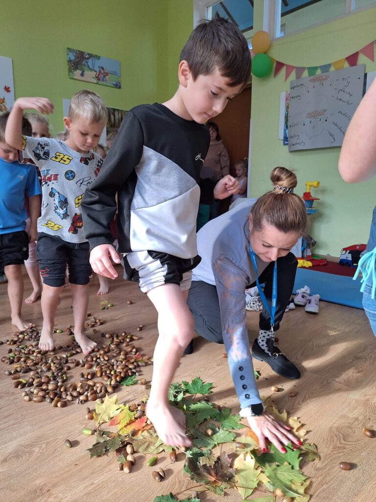 23 września obchodziliśmy pierwszy dzień jesieni. Dzieci podczas zajęć uczestniczyły w aktywnościach ruchowo-sensorycznych z wykorzystaniem naturalnych darów jesieni: liści, kasztanów, szyszek, żołędzi oraz piasku. Chodziły boso po przygotowanej ścieżce, doświadczając różnych faktur i kształtów. Ćwiczyły równowagę, koordynację ruchową oraz rozwijały wrażliwość dotykową. Zajęcia sprzyjały integracji sensorycznej, wzbogacały słownictwo związane z jesienią, a także dostarczyły dzieciom radości i relaksu w kontakcie z naturą.