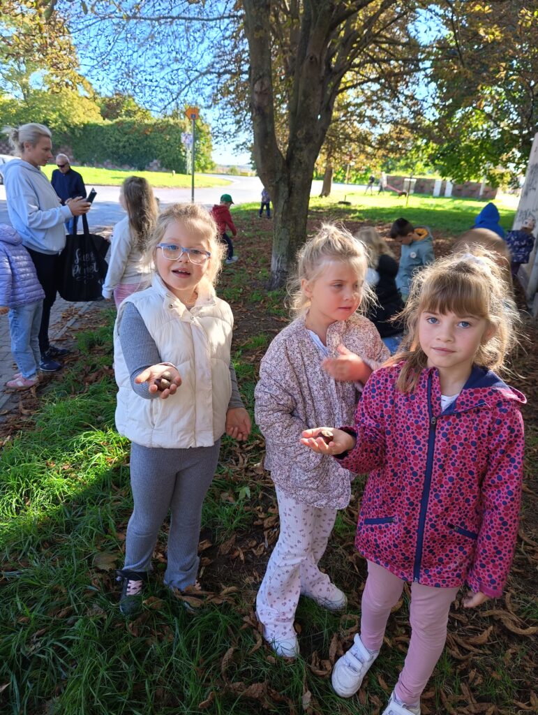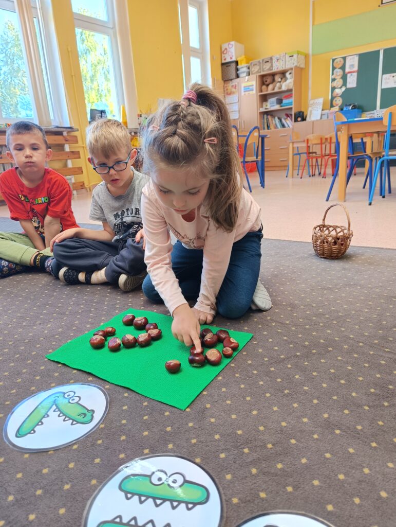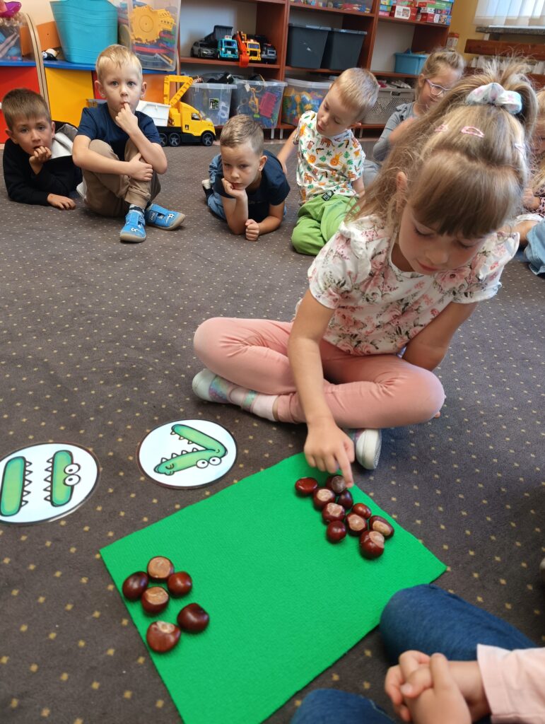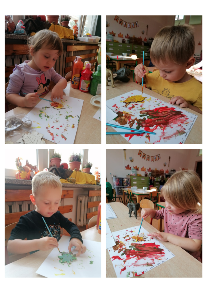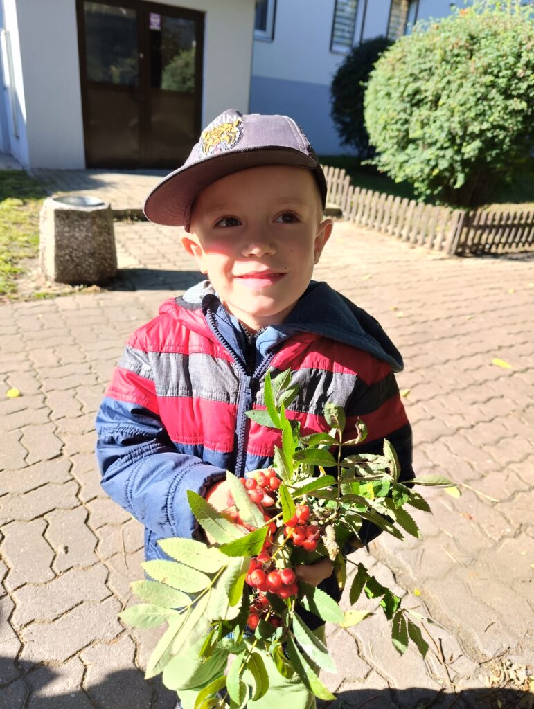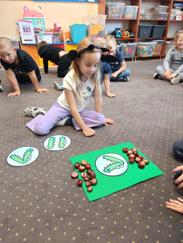 23 września obchodziliśmy pierwszy dzień jesieni. Dzieci podczas zajęć uczestniczyły w aktywnościach ruchowo-sensorycznych z wykorzystaniem naturalnych darów jesieni: liści, kasztanów, szyszek, żołędzi oraz piasku. Chodziły boso po przygotowanej ścieżce, doświadczając różnych faktur i kształtów. Ćwiczyły równowagę, koordynację ruchową oraz rozwijały wrażliwość dotykową. Zajęcia sprzyjały integracji sensorycznej, wzbogacały słownictwo związane z jesienią, a także dostarczyły dzieciom radości i relaksu w kontakcie z naturą.