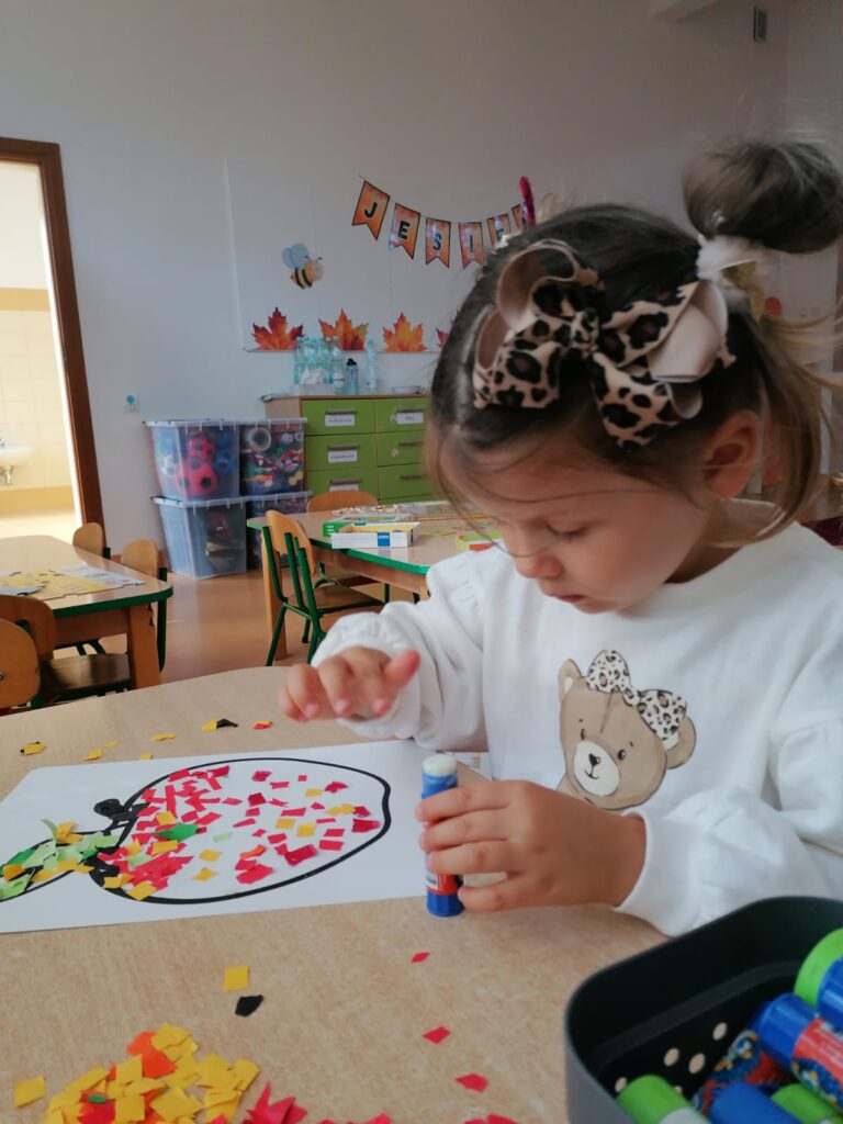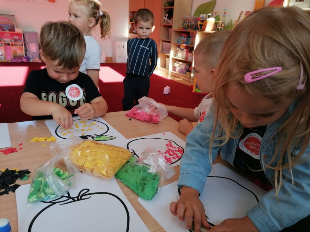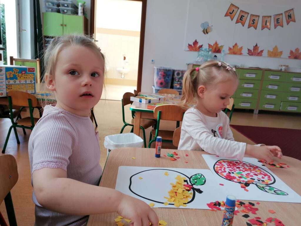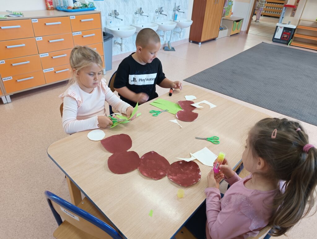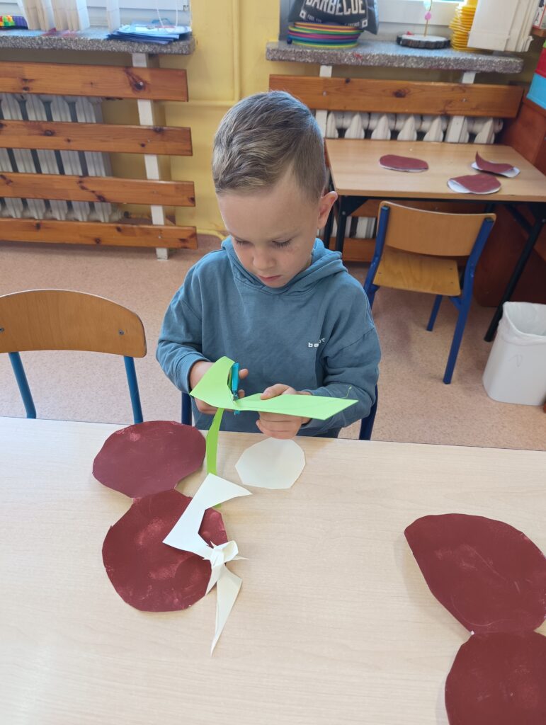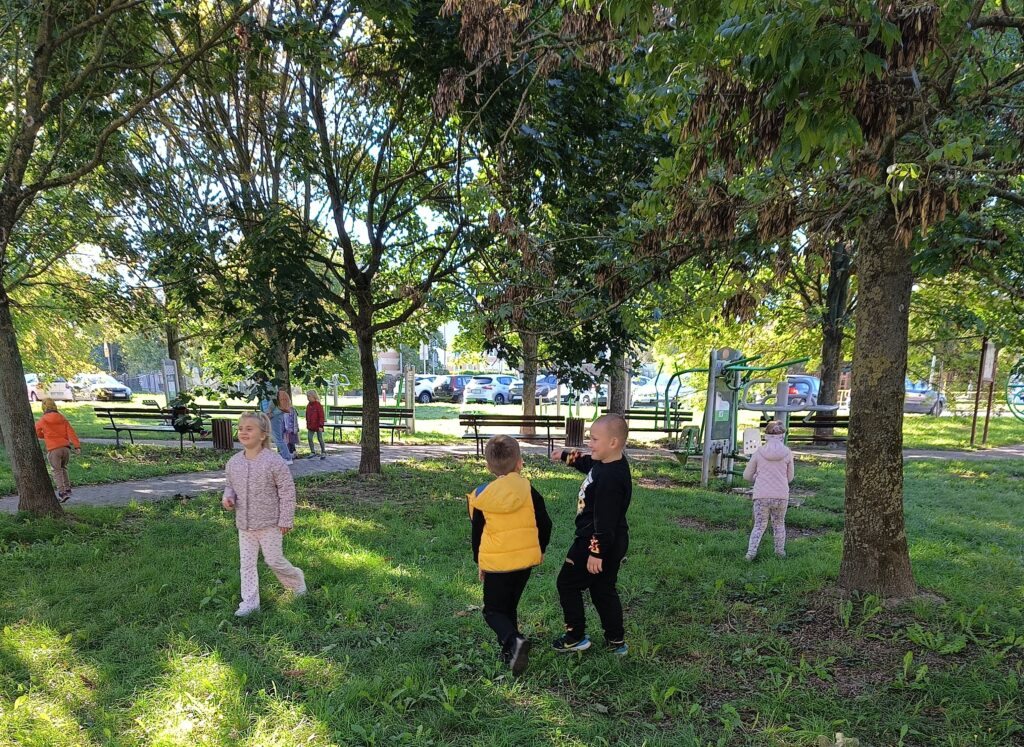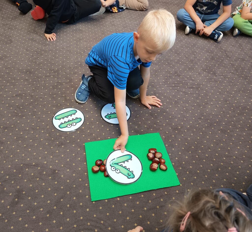 23 września obchodziliśmy pierwszy dzień jesieni. Dzieci podczas zajęć uczestniczyły w aktywnościach ruchowo-sensorycznych z wykorzystaniem naturalnych darów jesieni: liści, kasztanów, szyszek, żołędzi oraz piasku. Chodziły boso po przygotowanej ścieżce, doświadczając różnych faktur i kształtów. Ćwiczyły równowagę, koordynację ruchową oraz rozwijały wrażliwość dotykową. Zajęcia sprzyjały integracji sensorycznej, wzbogacały słownictwo związane z jesienią, a także dostarczyły dzieciom radości i relaksu w kontakcie z naturą.