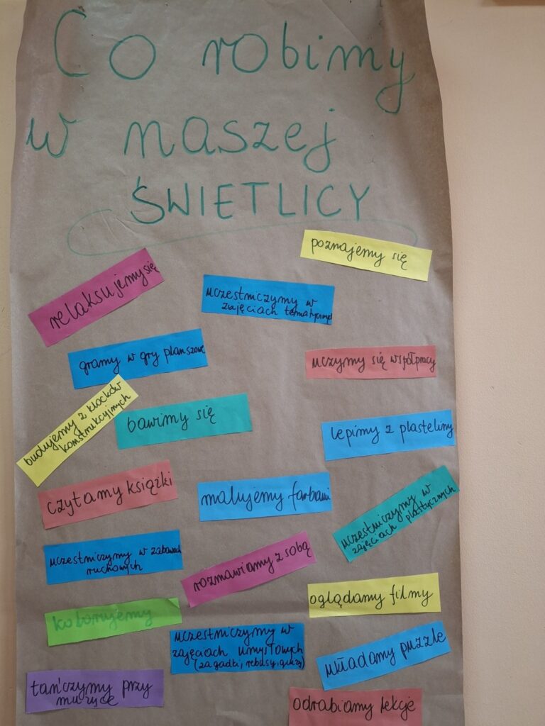 W drugim tygodniu września, dzieci uczęszczające do świetlicy zapoznały się ze zwyczajami i tradycjami świetlicowymi. W zajęciach grupowych opracowały mapę aktywności świetlicowych i stworzyły indywidualne pomysły na swoją wymarzoną świetlicę.