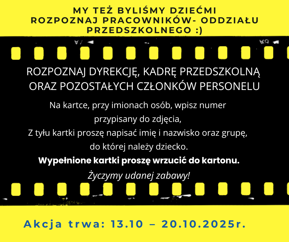Serdecznie zapraszamy wszystkie dzieci wraz z rodzicami do udziału w wyjątkowej i pełnej uśmiechu akcji, która trwa od 13 do 20 października 2025 r. W ramach zabawy przygotowaliśmy zdjęcia pracowników przedszkola z czasów ich dzieciństwa. Zachęcamy Państwa do wspólnego rozpoznania pracowników przedszkola na podstawie ich zdjęć z dzieciństwa. Wypełnione podpisane imieniem i nazwą grupy dziecka kartki z odpowiedziami prosimy wrzucać do przygotowanego, oznaczonego kartonu. Na wszystkich uczestników czekają drobne nagrody oraz miłe niespodzianki. Życzymy udanej zabawy!.