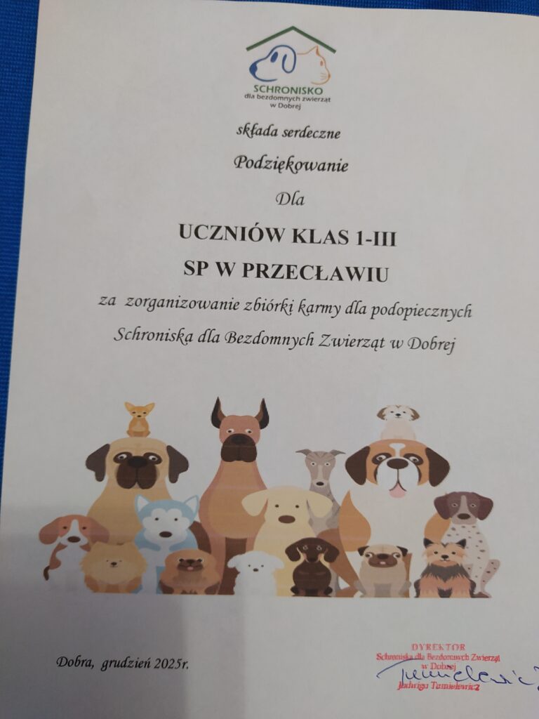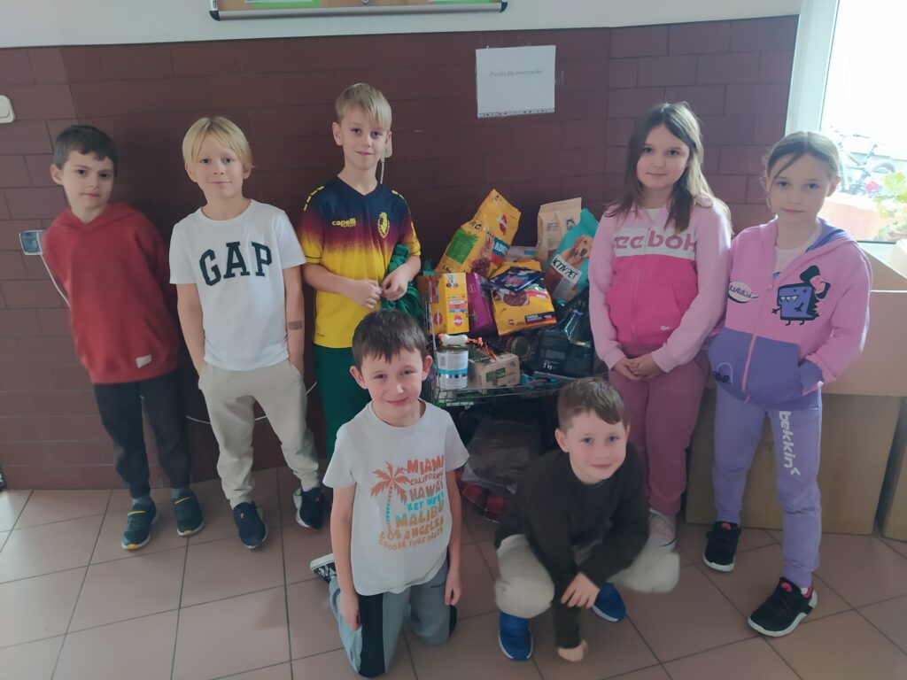 W dniach 4–28 listopada w naszej szkole po raz kolejny odbyła się coroczna akcja charytatywna „Paczka dla zwierzaczka”, podczas której zbieraliśmy karmę, koce oraz inne akcesoria niezbędne zwierzętom ze schroniska dla bezdomnych zwierząt w Dobrej Szczecińskiej. Dzięki ogromnemu zaangażowaniu uczniów klas 1–3 oraz ich rodziców udało się zebrać imponującą ilość darów, które trafią do potrzebujących podopiecznych schroniska. Wasza życzliwość, wrażliwość i chęć niesienia pomocy pokazują, że wspólnie możemy zrobić wiele dobrego.