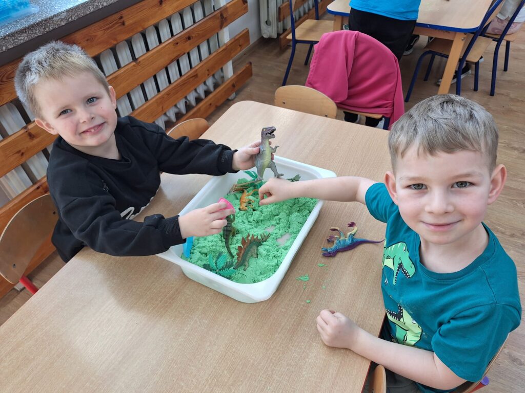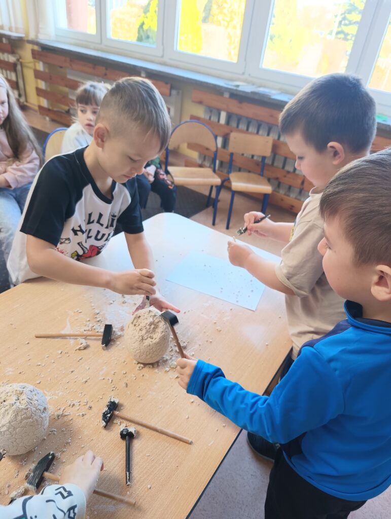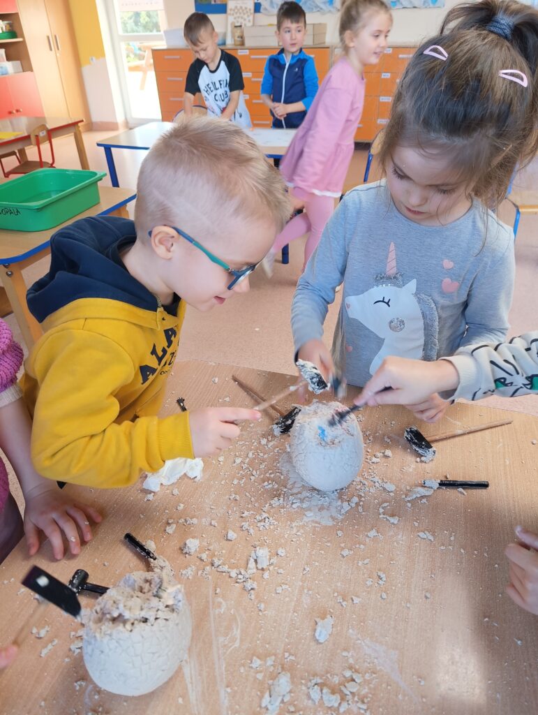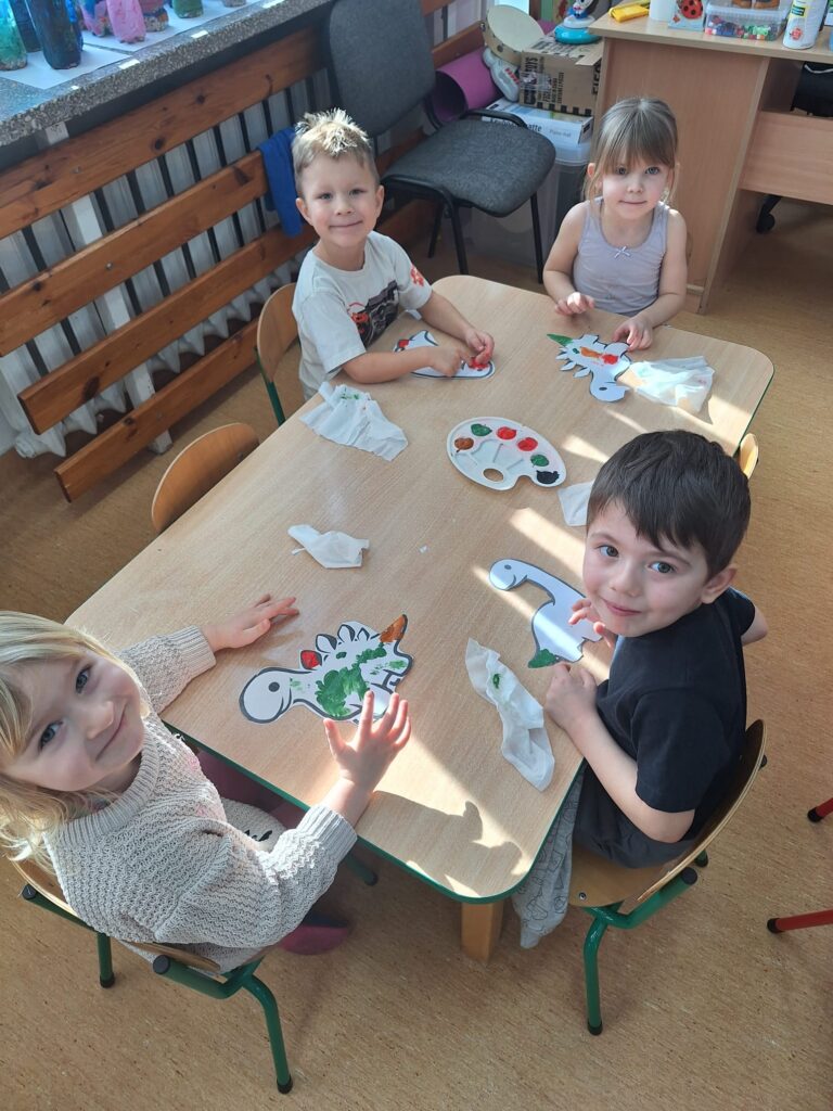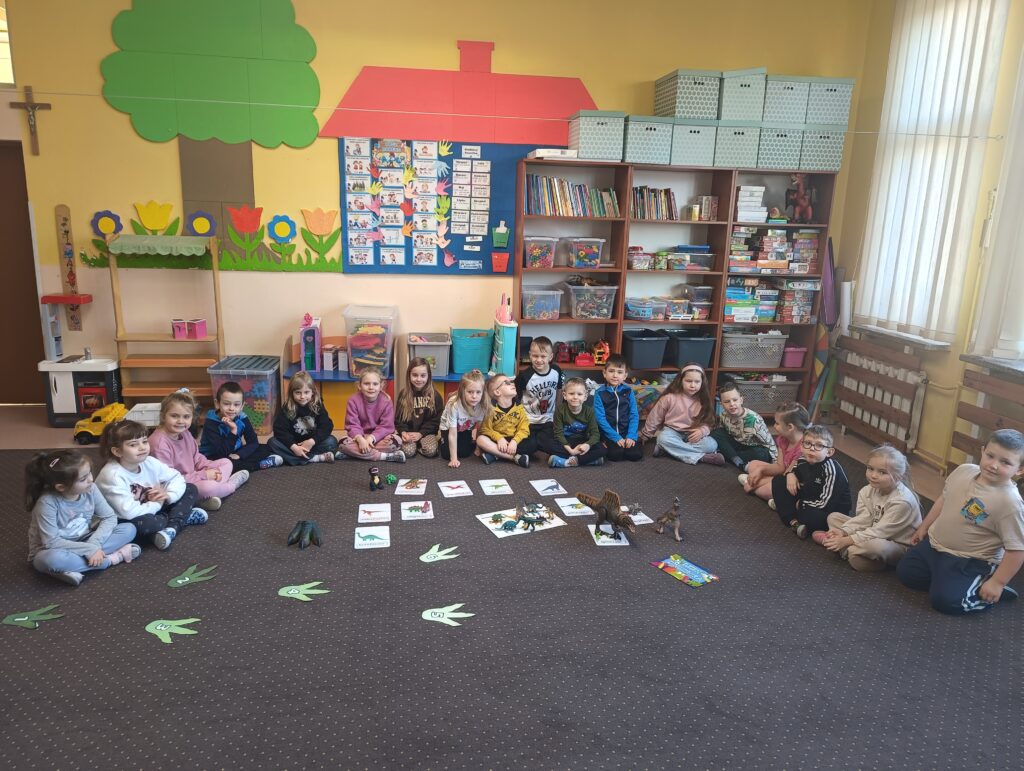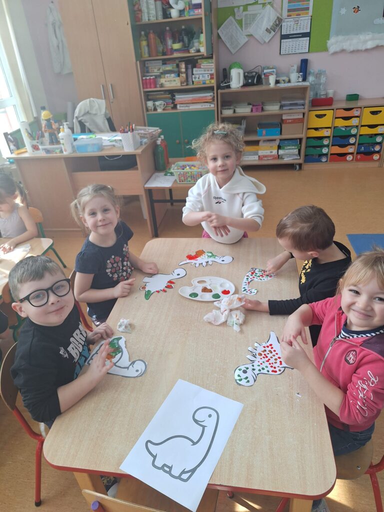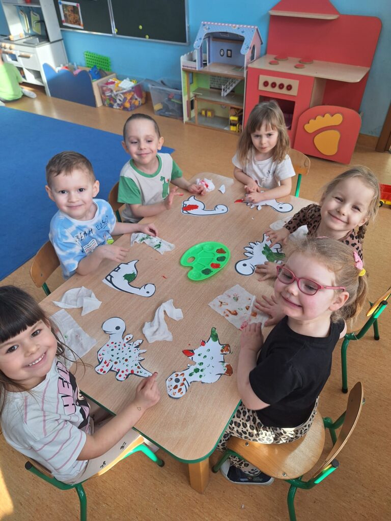 Z okazji Dnia Dinozaura dzieci przeniosły się w fascynujący świat prehistorycznych gadów. Poznały historię dinozaurów oraz dowiedziały się, na czym polega praca paleontologa, a także oglądały plansze przedstawiające różne gatunki dinozaurów. Przedszkolaki brały udział w zabawach ruchowych „Śladami dinozaurów”, a także wcieliły się w małych odkrywców podczas wykopalisk, wydobywając ukryte w środku niespodzianki. Był to dzień pełen radości, ciekawych doświadczeń i wspaniałej zabawy.
