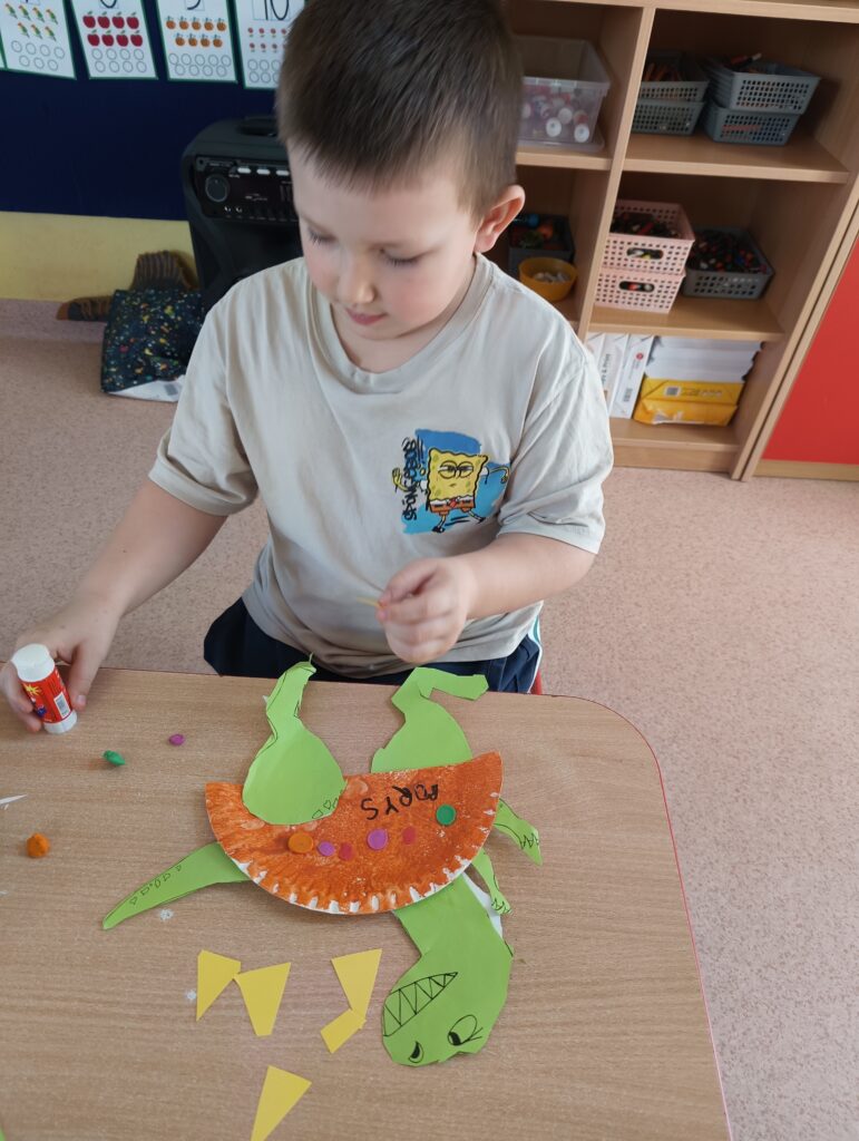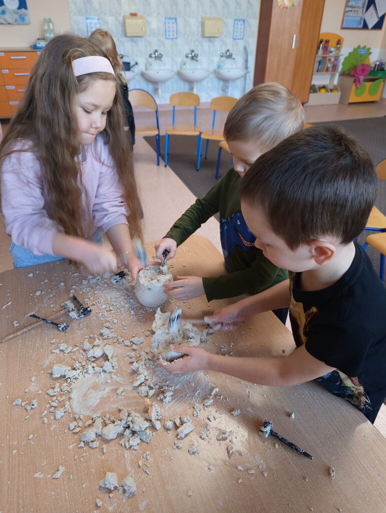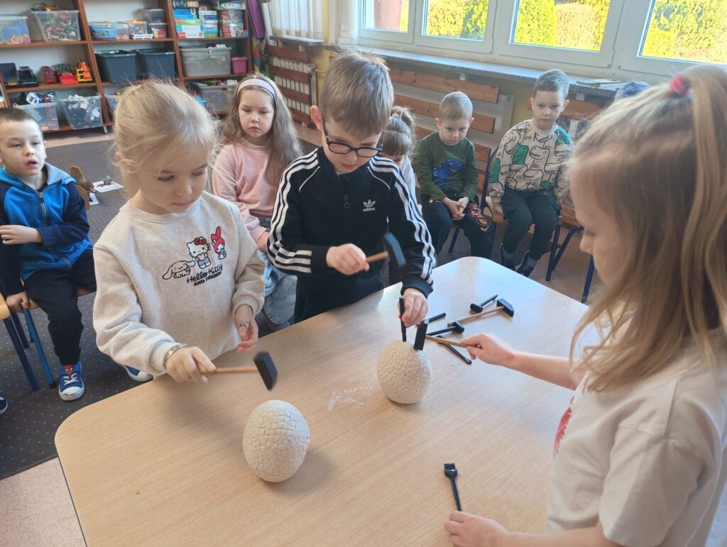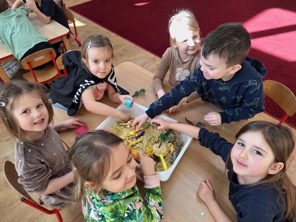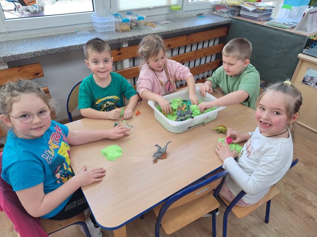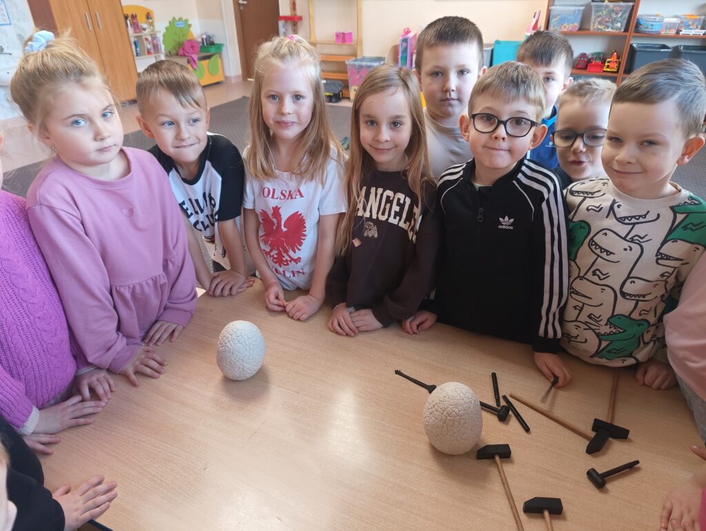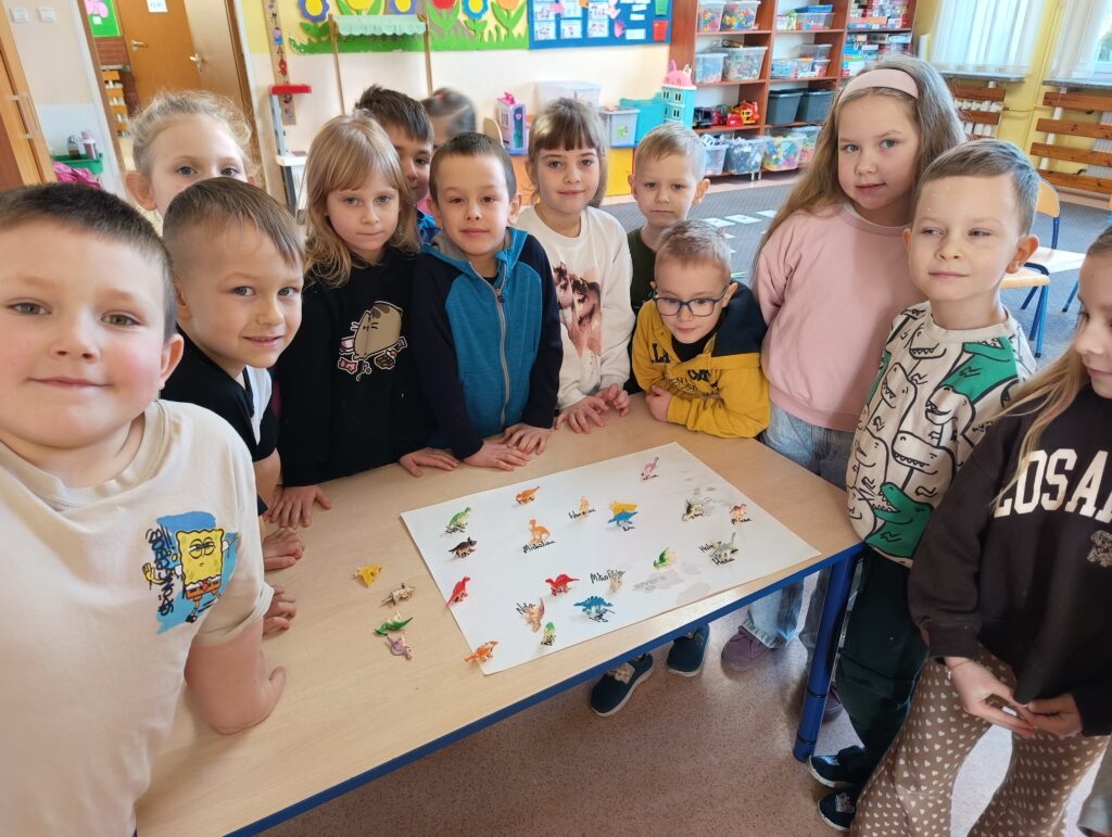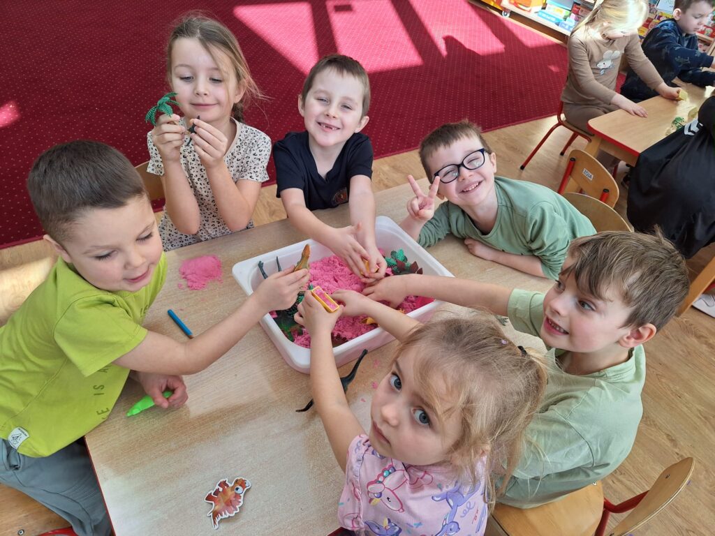Z okazji Dnia Dinozaura dzieci przeniosły się w fascynujący świat prehistorycznych gadów. Poznały historię dinozaurów oraz dowiedziały się, na czym polega praca paleontologa, a także oglądały plansze przedstawiające różne gatunki dinozaurów. Przedszkolaki brały udział w zabawach ruchowych „Śladami dinozaurów”, a także wcieliły się w małych odkrywców podczas wykopalisk, wydobywając ukryte w środku niespodzianki. Był to dzień pełen radości, ciekawych doświadczeń i wspaniałej zabawy.