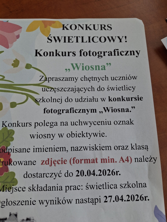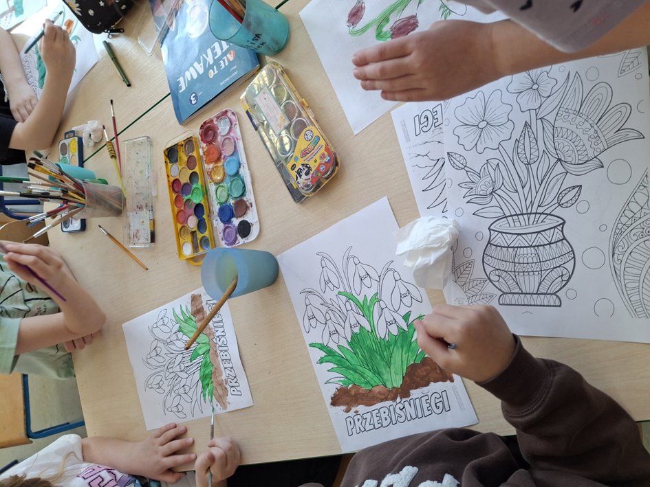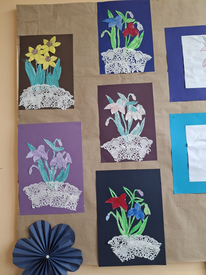 W kolejnym tygodniu dzieci przygotowywały się do powitania wiosny. W świetlicy w tym czasie wykonywały prace plastyczne z kwiatami wiosennymi w roli głównej. Prace wykorzystano do dekoracji sali, hollu szkolnego i korytarza.